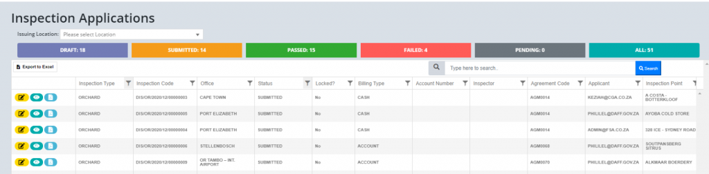 - The dashboard shows the number of DRAFT, SUBMITTED, PASSED, FAILED, PENDING and ALL applications in a colour coded box at the top of the screen.