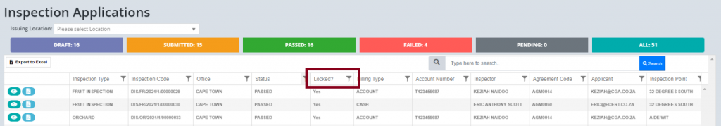 - Filter: Click on the Filter icon for your search criteria or select Issuing Location Filter