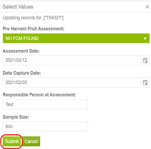 Select “NO LIVE FCM” if the orchard delivery passed the assessment under Packhouse Delivery Assessment. If live FCM was found select “LIVE FCM FOUND” at Packhouse Delivery Assessment.