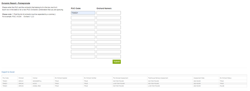 - Type in the PUC-orchard/s combination you want to see the statuses for. Then click Submit.